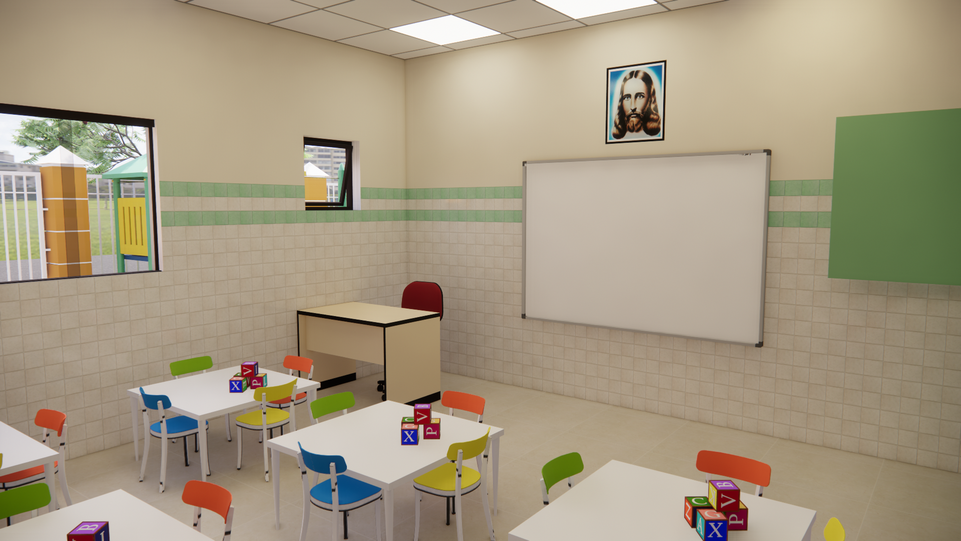 Salas equipadas con sillitas de colores, pizarrones, ventiladores y todas las comodidades para que los niños puedas estudiar tranquilamente.